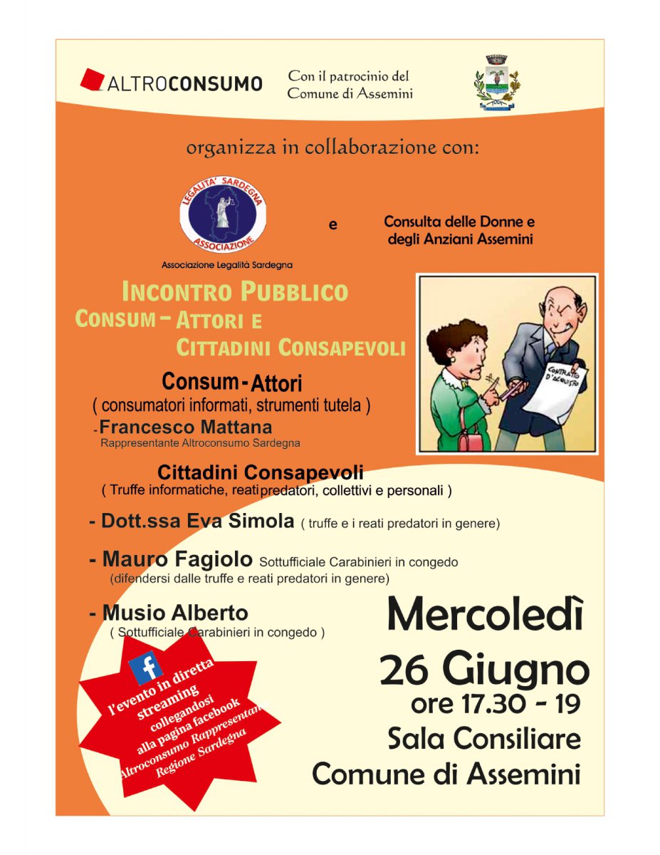 L’evento si terrà nella Sala consiliare del Comune di Assemini il prossimo 26 giugno 2019 alle ore 17:30 e vedrà la partecipazione di Francesco Mattana, responsabile di Altroconsumo Sardegna. Saranno presenti anche la dottoressa Eva Simola, che parlerà di truffe e reati predatori in generale, nonché i sottufficiali in congedo dei Carabinieri Mauro Fagiolo e Musio Alberto, i quali sapranno dare consigli efficaci per difendersi dai malintenzionati. L’evento sarà trasmesso in diretta streaming sulla pagina Facebook Altroconsumo Rappresentante Regione Sardegna.